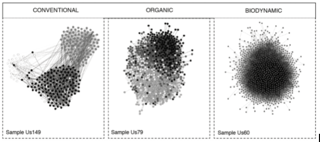 Each point represents a species, the density of the points refers to the richness, the size of each point correlates to the balance, and ecology is represented by the lines and functions of the clustering. Using this approach, it’s easier to differentiate high or low biodiversity levels and to track how different management practices can improve or hinder biodiversity, soil health and sustainability.